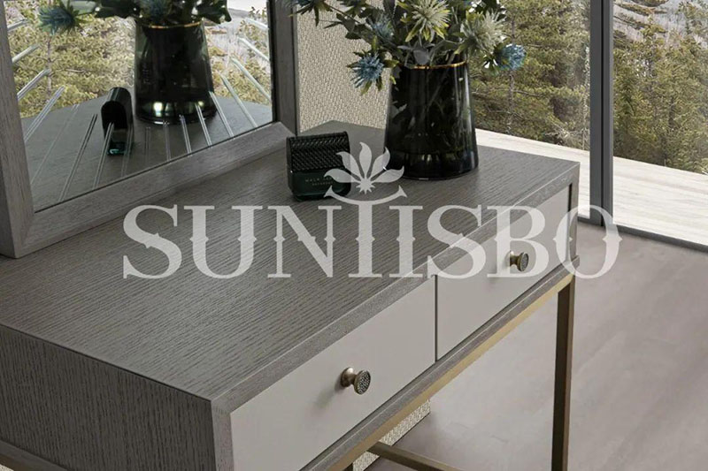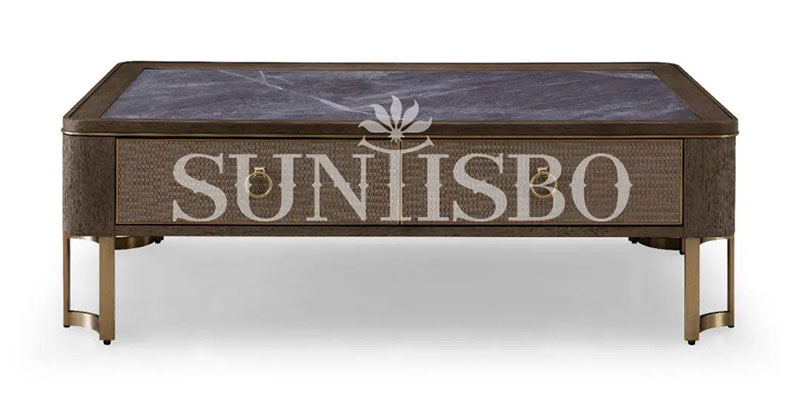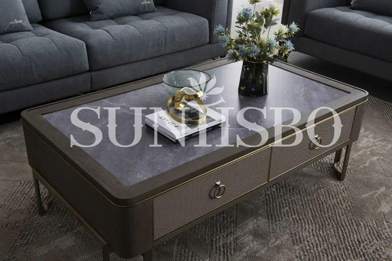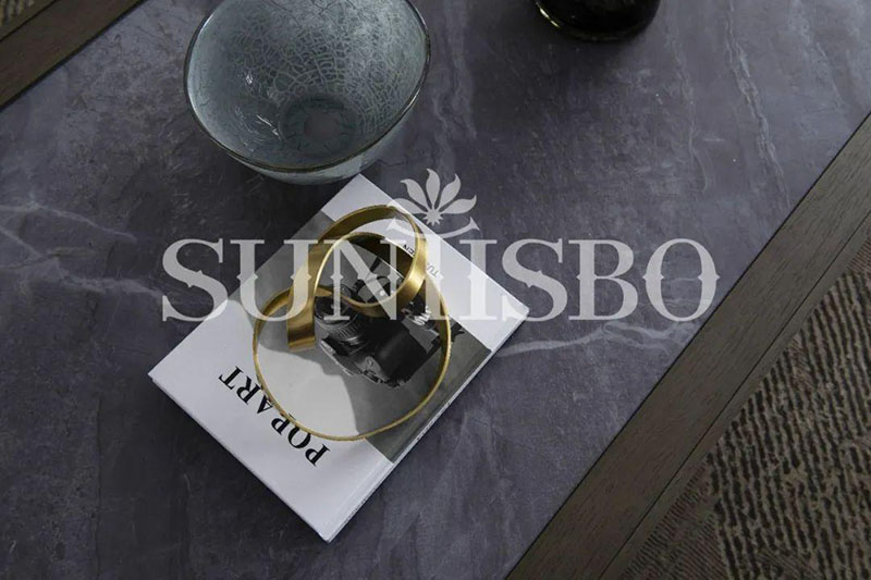 茶幾桌面采用仿巖板質(zhì)感的巖玻,既保留了鋼化玻璃的超強硬度,同時擁有玻璃的通透感與巖板紋理的現(xiàn)代感。玻璃與巖板產(chǎn)生的撞色,提升了空間的氣韻。