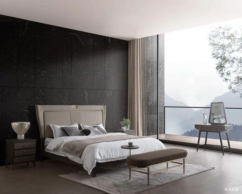 次臥床頭背景沿用了暗色大理石護(hù)墻,空間層次分明,簡(jiǎn)約時(shí)尚的米色床屏糅合金屬鑲嵌與真皮編織藝術(shù),看似舒適隨意,卻在極簡(jiǎn)中透著淡淡的奢華感。大面積的落地窗讓自然光傾入室內(nèi),拉上與床屏同色系的窗簾,令次臥的室內(nèi)空間明暗有度。