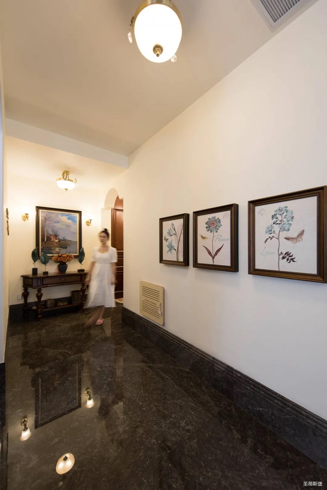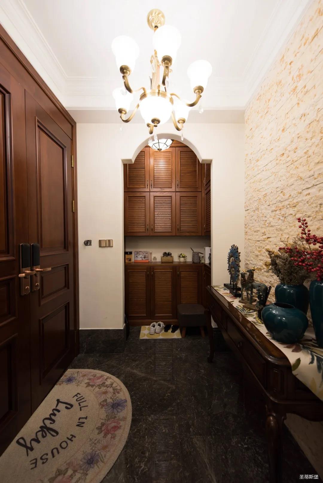 入戶玄關(guān)雙開門設(shè)計(jì),儀式感滿滿!地面定制的瓷磚貼花設(shè)計(jì),典雅又大方。核桃實(shí)木玄關(guān)桌,加上精致的擺件,經(jīng)典美式復(fù)古吊燈,不著痕跡的展現(xiàn)出居者對生活的激情,魅力吸睛,從入戶開始感受古典氛圍。