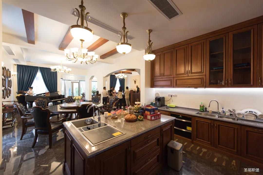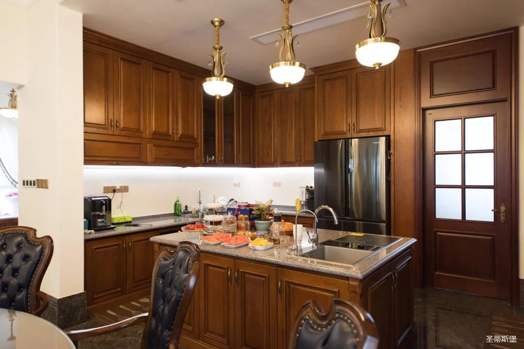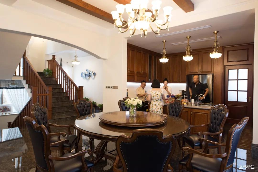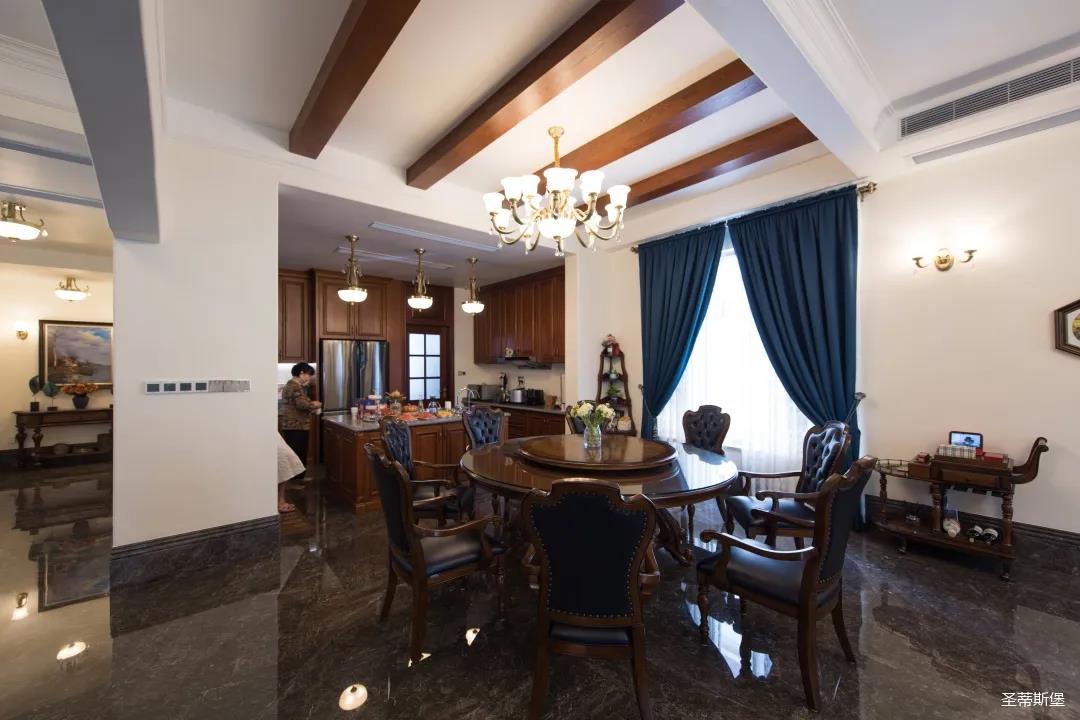 玄關(guān)進(jìn)入轉(zhuǎn)角處,以穩(wěn)重大氣實(shí)木為主色調(diào)的開放式中西餐廚空間,將一體化無隔斷設(shè)計(jì)貫徹到每個(gè)細(xì)節(jié),采用了親膚真皮質(zhì)感的餐椅,手工雕刻的曲線讓原本硬朗的空間變得格外優(yōu)雅,自上而下,構(gòu)成完整的美式空間氣度,在每天的生活點(diǎn)滴間,沉浸在美式風(fēng)情中,更加隨性舒適。