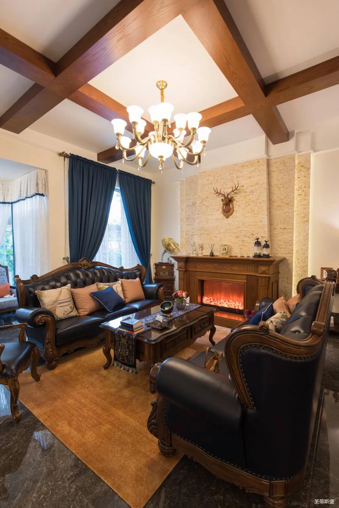 歐美實(shí)木吊頂設(shè)計(jì),與沙發(fā)茶幾上下呼應(yīng),相得益彰,提升了空間層次感。