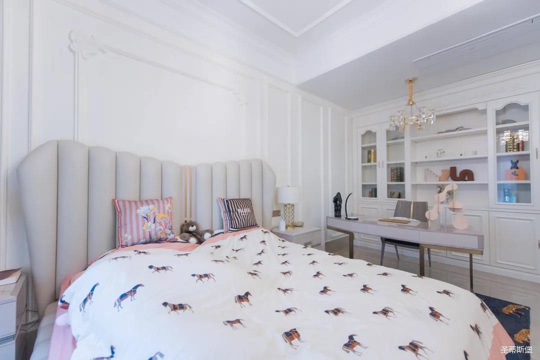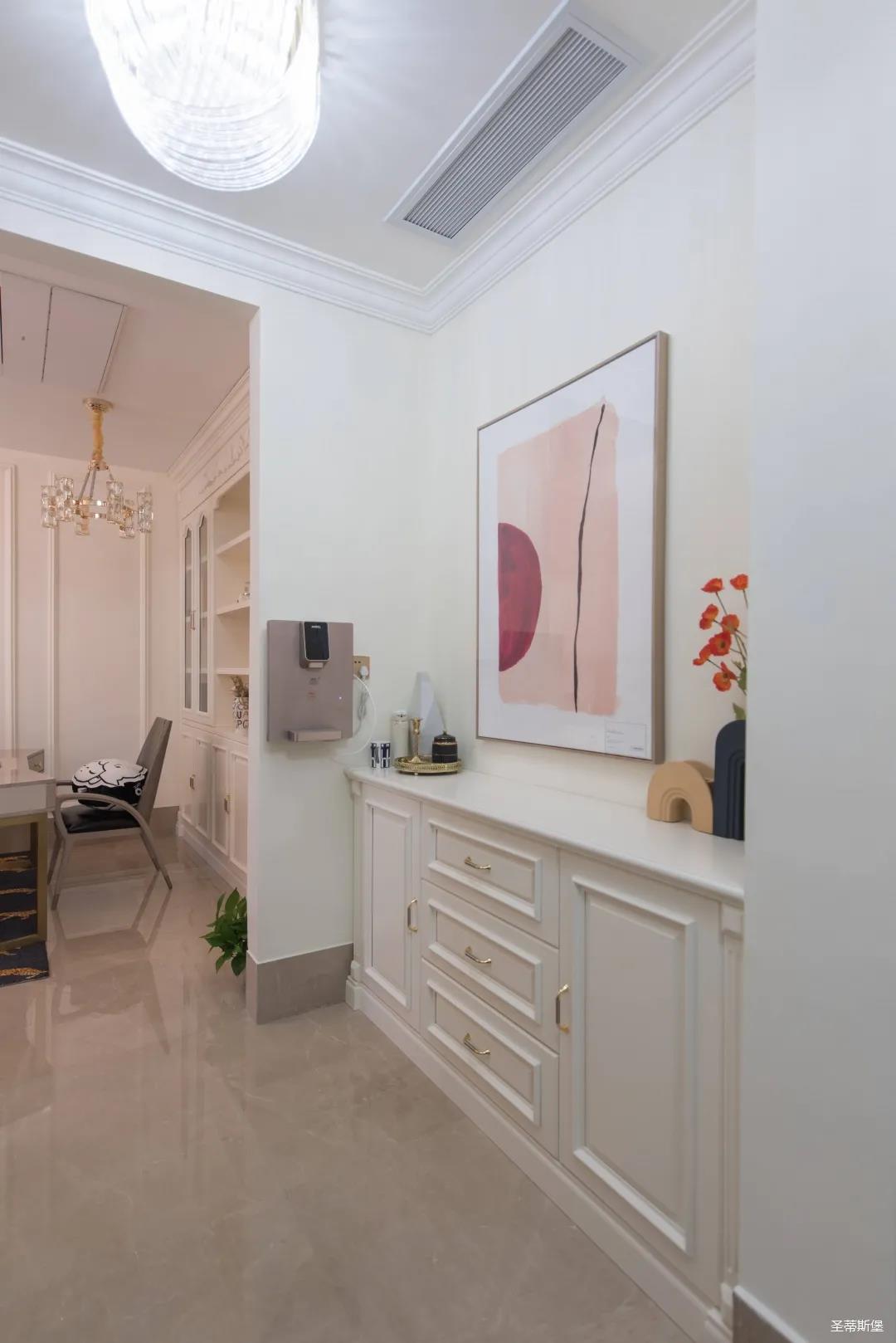 經(jīng)過房間玄關(guān)過道,一眼就被這夢幻的景象給征服,摒棄繁雜,少許的金色元素點(diǎn)綴,予以空間輕奢細(xì)膩的質(zhì)感,卻又不失美式韻味。