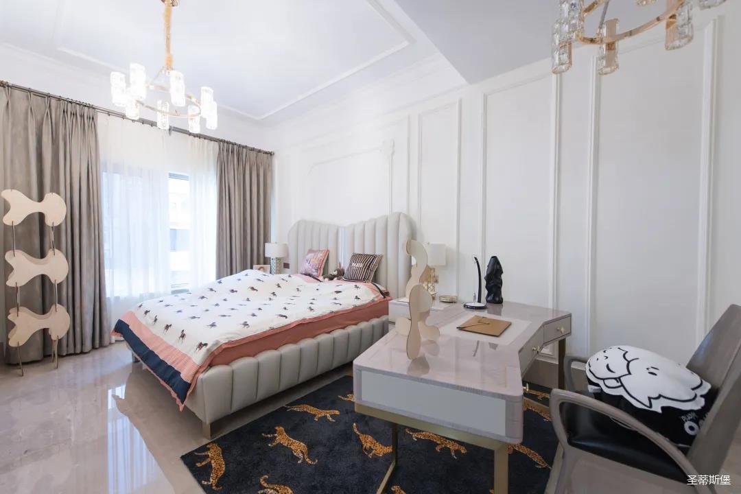 三樓是兩間臥房,每一間臥室都有自己的特定屬性。主人房端莊優(yōu)雅,雍容盡顯;墻面以簡潔的美式石膏線修飾,波浪形的實(shí)木床屏上點(diǎn)綴著太陽形狀的手工雕花,宛如海平面上剛出升的太陽,讓整個(gè)空間色彩奔放。