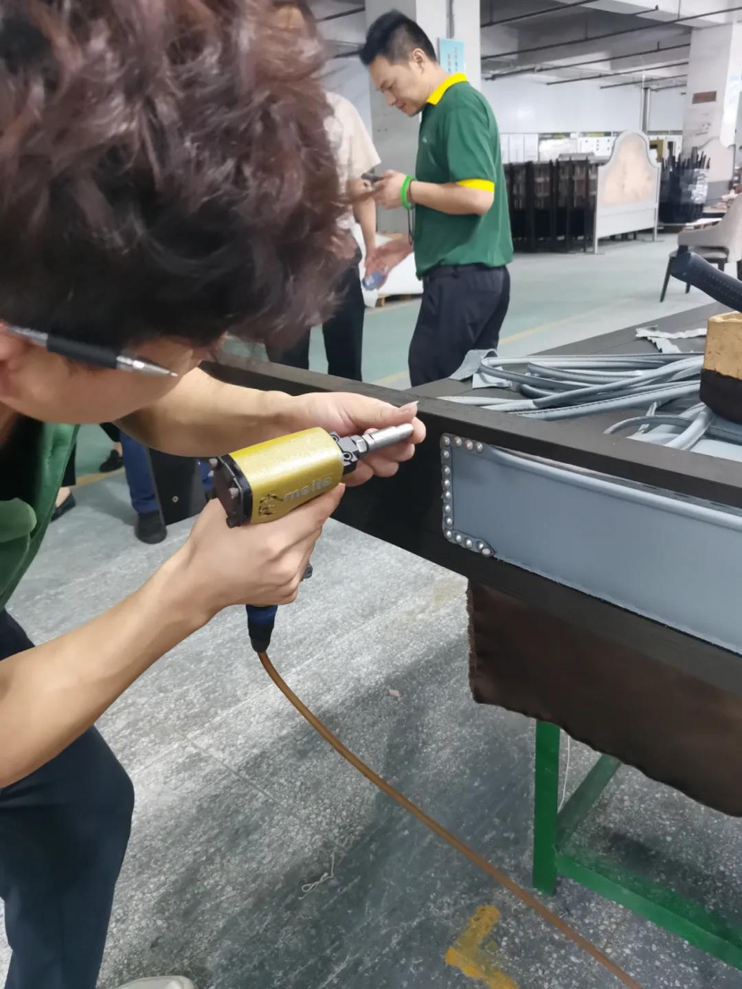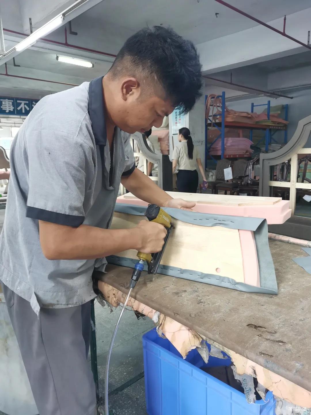 本屆技能競(jìng)賽設(shè)置為工業(yè)組和商業(yè)組,共設(shè)競(jìng)賽項(xiàng)目8項(xiàng),其中,工業(yè)組競(jìng)賽包含了打滾邊、打銅釘、自身產(chǎn)品組裝、成品組裝、柜體噴底色、修色、板材開料等七大細(xì)項(xiàng)。商業(yè)組以組裝辦公臺(tái)、床頭柜為主。
