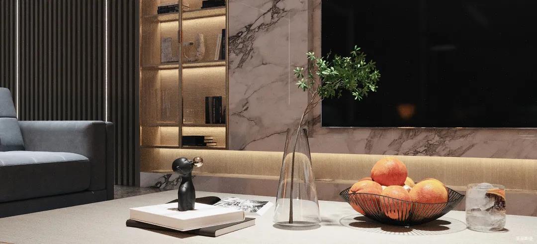 為了減輕現(xiàn)代都市工作的忙碌,客廳設計更偏向于對生活“解壓”的極簡,精選自然紋理的大理石與實木定制柜做一體化設計,并在電視背景墻下半部分做挑空設計,安裝個性十足的線性燈帶,延伸客廳視覺深度。
