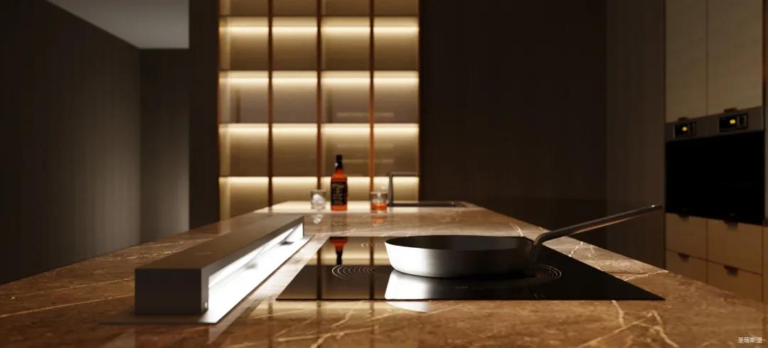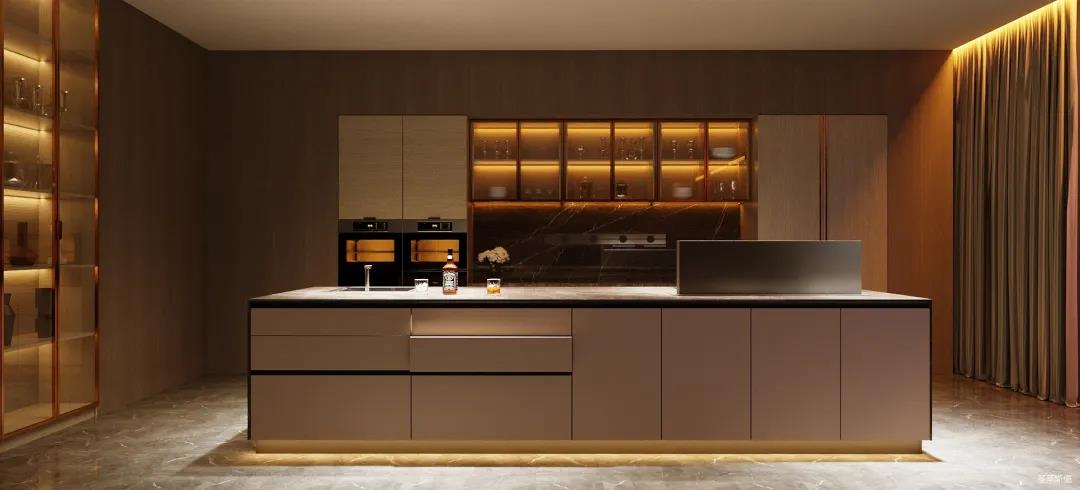 餐廚的極簡也可兼具多元,以一字內(nèi)嵌式展開的廚區(qū)收納柜,兼顧了從杯具、調(diào)料等廚用材料收納到廚電歸置動線功能處理。在展示區(qū)域,玻璃隔板組合實木定制柜的表現(xiàn)形式,更是提升了空間的明亮度與寬闊感。