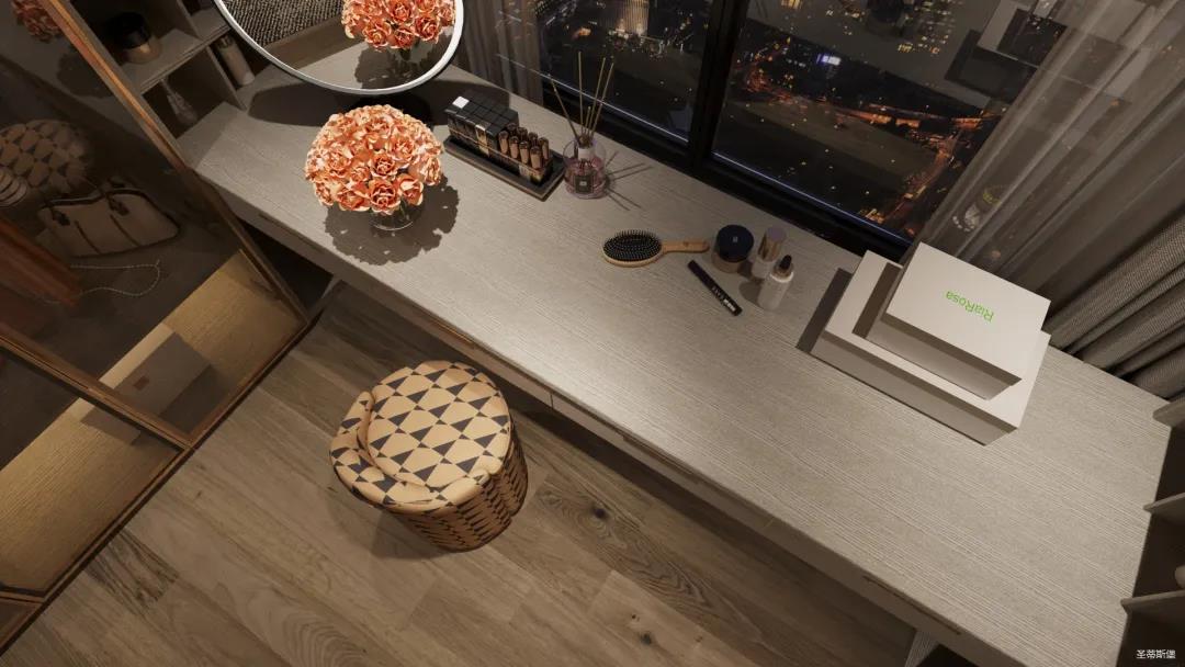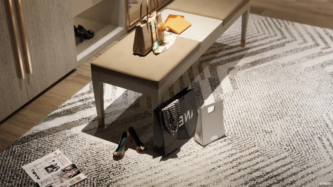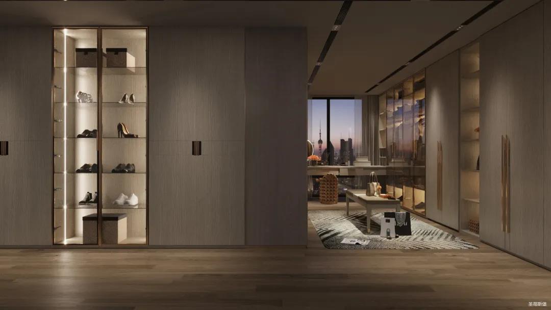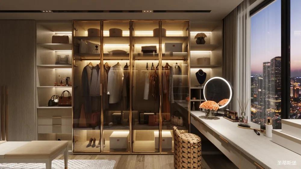 妝臺上隨心擺放的梳妝用品與櫥窗內(nèi)齊整的衣物收納形成鮮明對比,烘托出飽滿而真實的生活情境。人性化的合理分區(qū)收納也呈現(xiàn)了設計師在品質(zhì)與生活體驗上的精細。